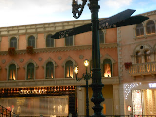 We could not bring ourselves to take a gondola ride in the channel--they were vacuuming things up along the canal in the morning, it smelled like chlorine and it just looked silly. The street signs showed the way to the bathrooms and food court.