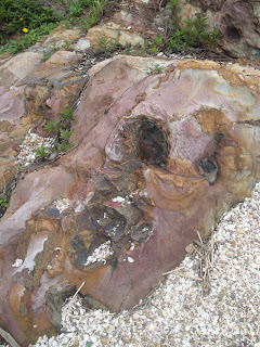 Among the feature that is called an accretion. These features, with high iron content, grew in size within the rocks. Once weathering began, the accretions leave behind a rounded hole in the rock.