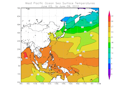 A satellite image with weather information, produced by Westernpacificweather.com, shows the location of the ITCZ and the typhoons that have been spinning off the past couple weeks. We have only had a typhoon warning level 1, but the overall daily weather has turned more tropical. Daily I experience both clouds and clear patches. Everyone is carrying an umbrella to either protect them from a cloud burst or the sun. This is the daily pattern--showers interspersed with sun throughout. Most of the rainfall is from convection--rising air from the heating of the earth's surface by the sun. Add the high levels of humidity, with ocean temperatures of 27 degrees C or 82 degrees F (!), and it takes very little rise for the air to reach saturation point.