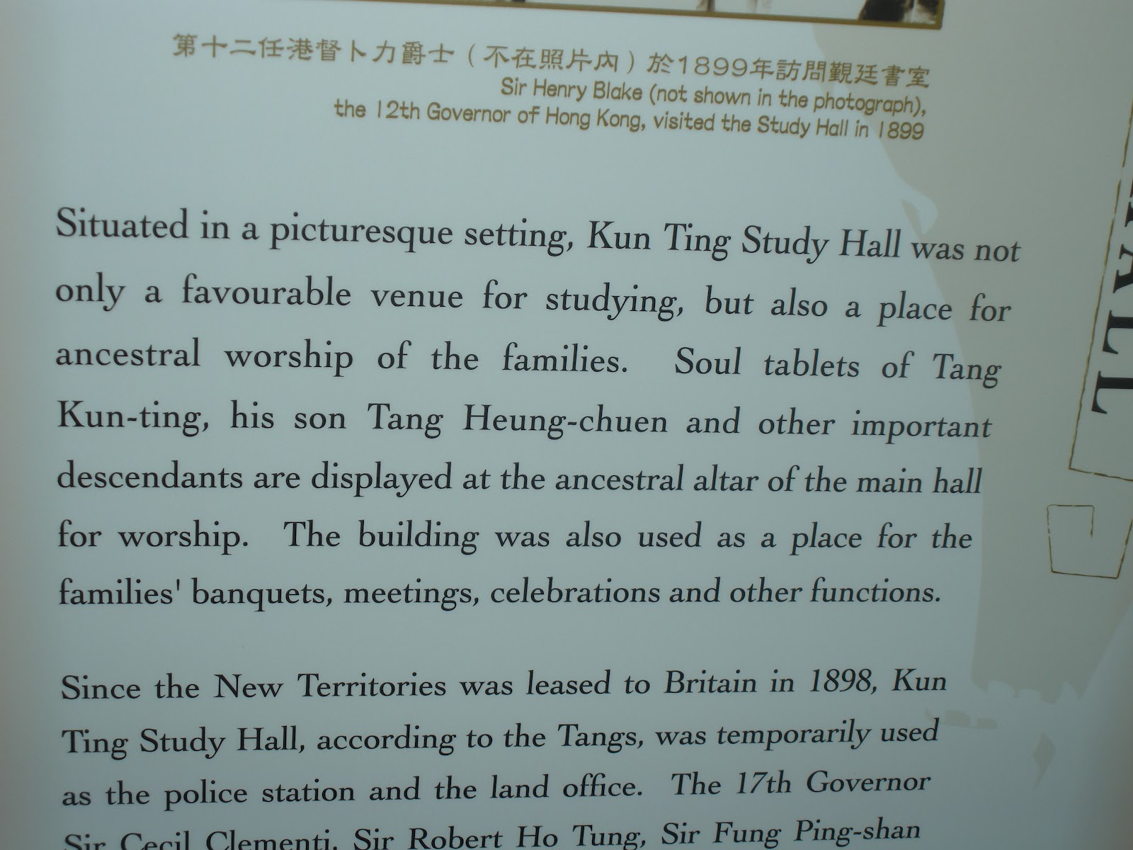 The Kang Yung Study Hall is one of the important features restored. It reflects the prominence of the Tang Clan in the New Territories, going back to around 1000 A.D. Such halls were built to reflect devotion to education. And of course, within the Chinese civilization, passage of the rigorous exams to become part of the civil service or bureaucracy brought great honor to your clan.